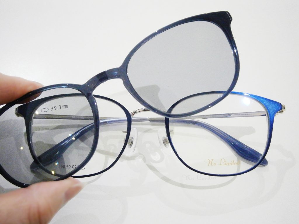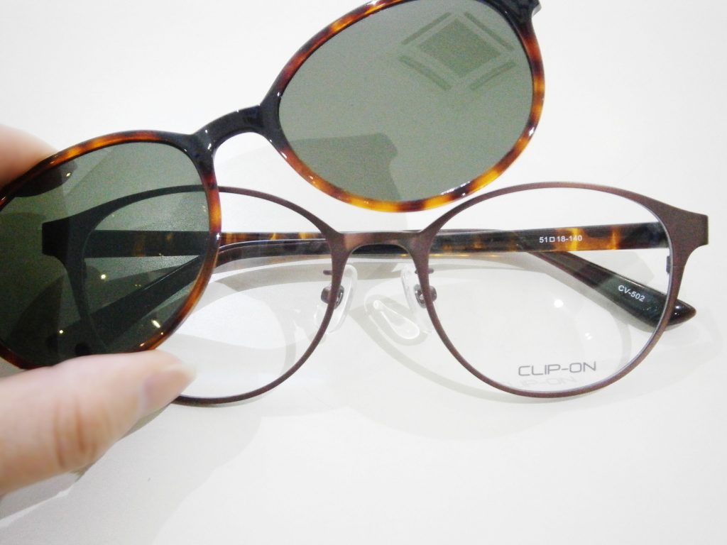 サングラスレンズがメガネフレームにマグネットで取り付けられる、クリップオンサングラスなのです!