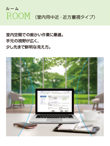 室内を広く見渡せる中間重視のタイプとPCモニターと手元の書類などを重視する近方重視タイプに分かれます。
