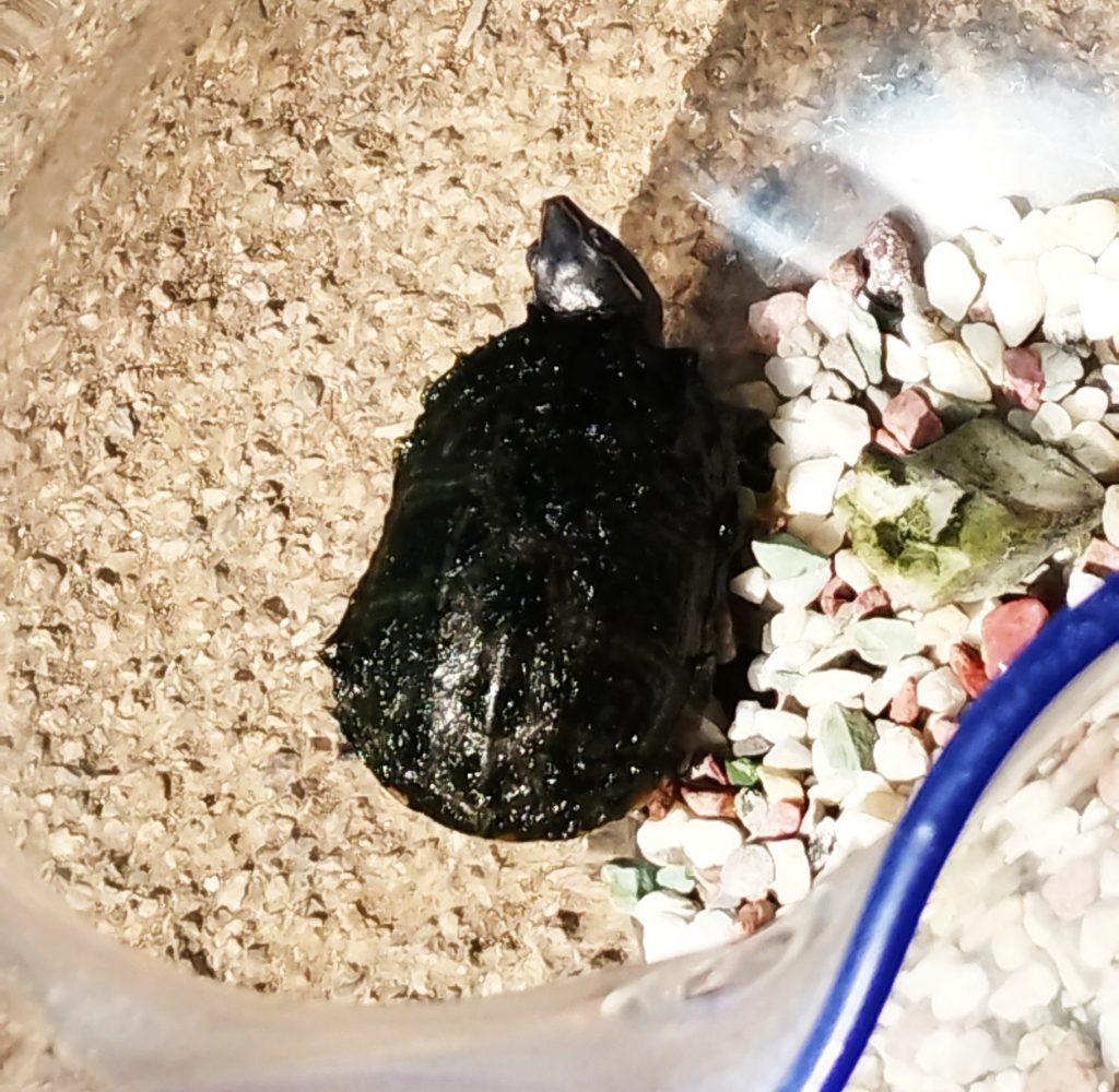 とても小さな亀【ミシシッピニオイガメ】冬の間に甲羅についたコケ、久しぶりの甲羅干しで乾かしています。